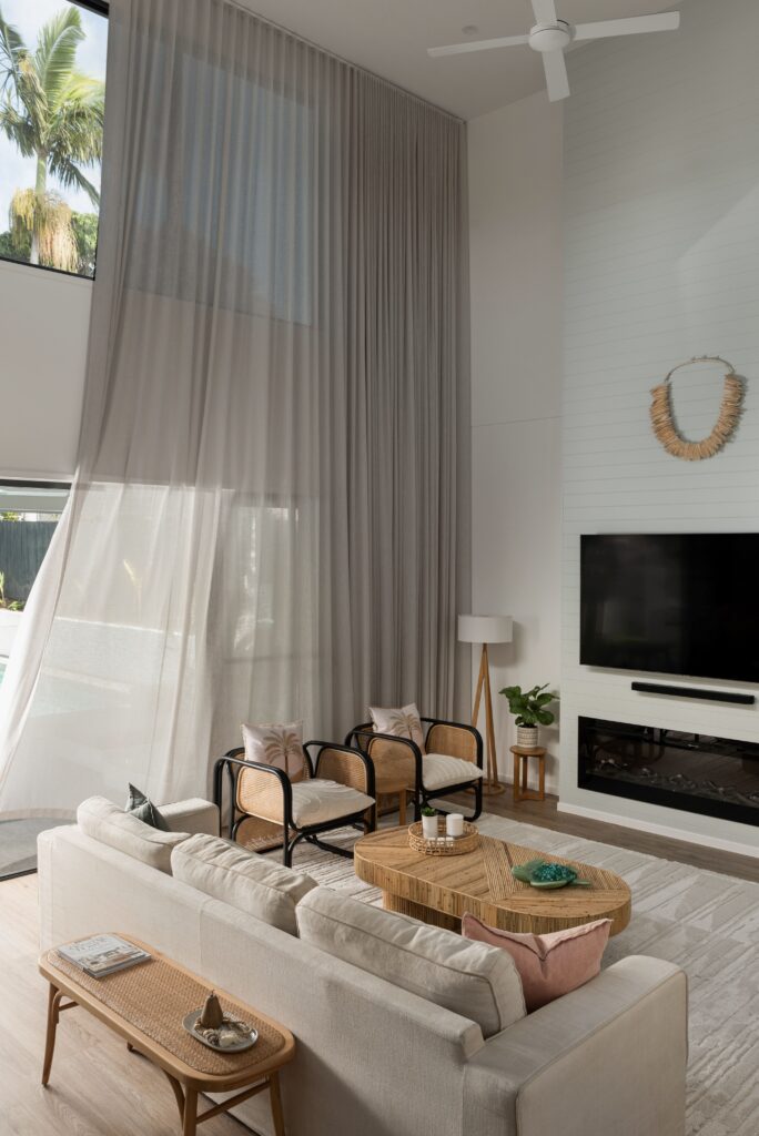 This stunning knockdown rebuild, was custom-built for a local family and their dog who wanted to make the most of their land in one of the Sunshine Coast’s original streets. The two-storey home features spacious rooms with a dramatic double-height void, a dedicated media room with sound proofing, a large upstairs living area and two unsuited bedrooms. The outdoor space is equally impressive with a huge pool, a yard for the dog and an outdoor kitchen. During the construction phase, we respected the existing Neighbours and preserved the desired existing trees. The result is a home that blends in beautifully with its surroundings and showcases the modern style of the Sunshine Coast.